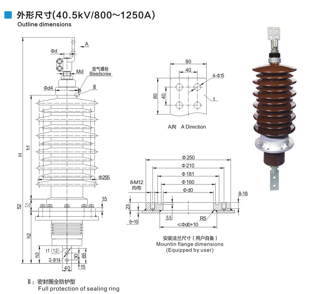 鋁法蘭瓷套管40.5kV/800~1250A穿桿式套管